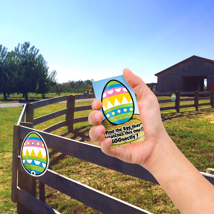 - 1 Game sign to engage your guests into play (24" x 18"). The sign also comes with 11 eggs (all different designs) that velcro to the board, so you can change the egg to seek, day to day. (good for repeat visitors).