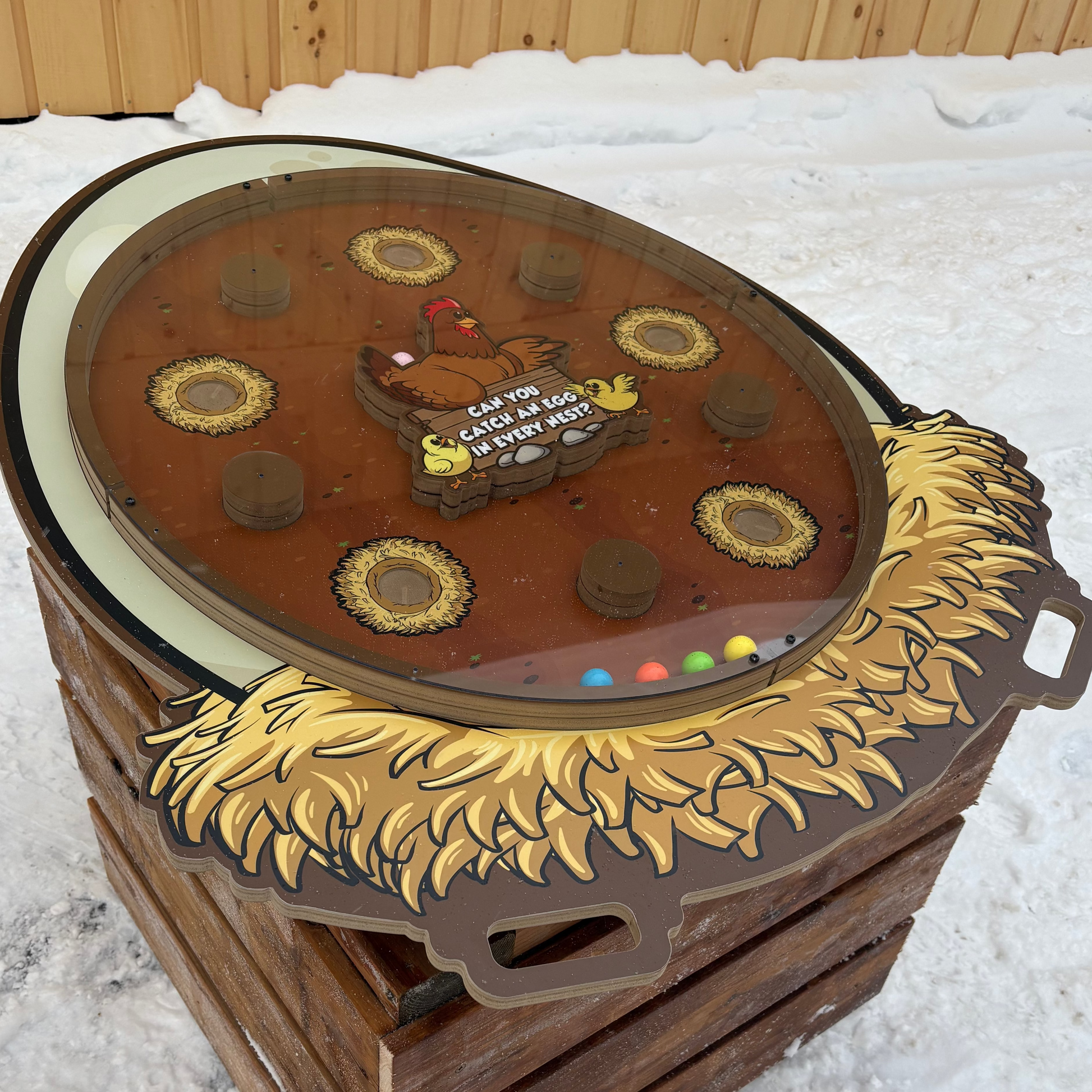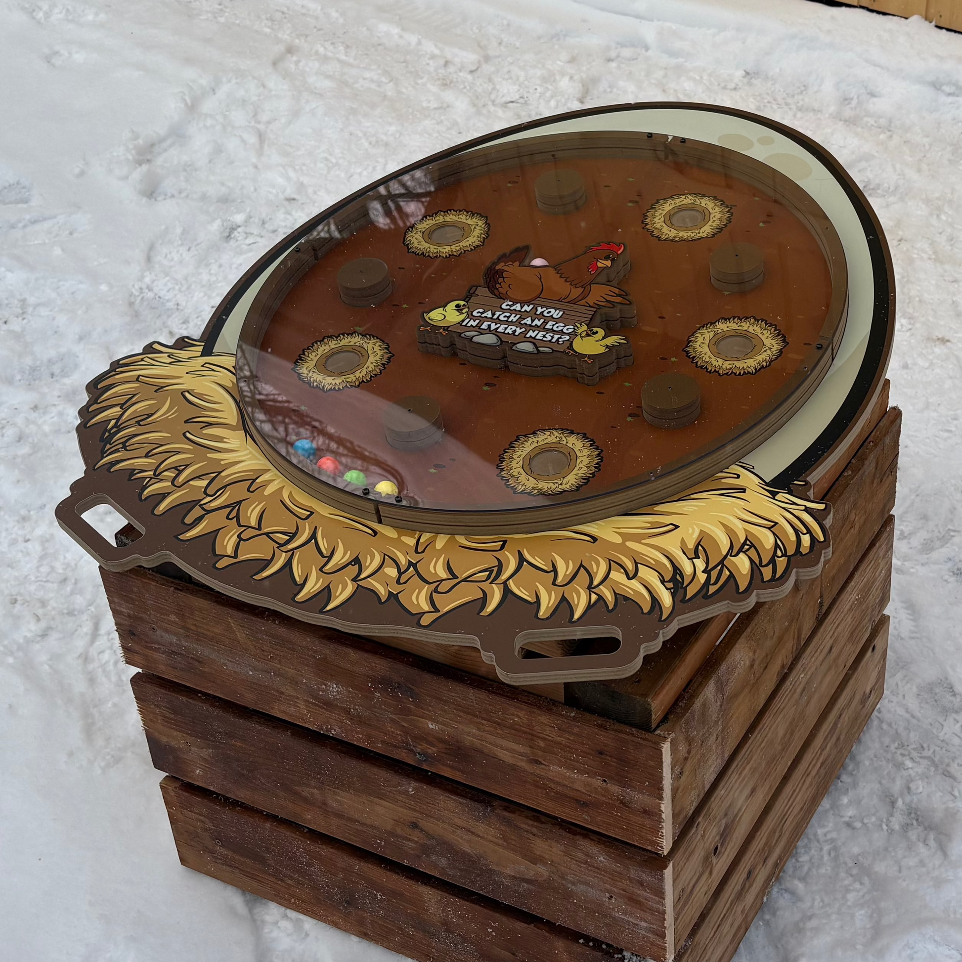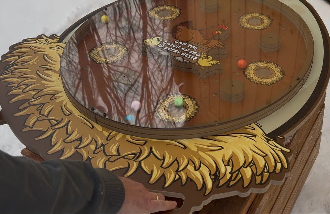 Tilt-a-Maze jr. edition is played on one level (no holes to fall through), and will appeal to younger players. The large egg shape (approx 32" x 37" ) invites kids to run over and lift, tilt, and play! Can you get an egg in each nest?